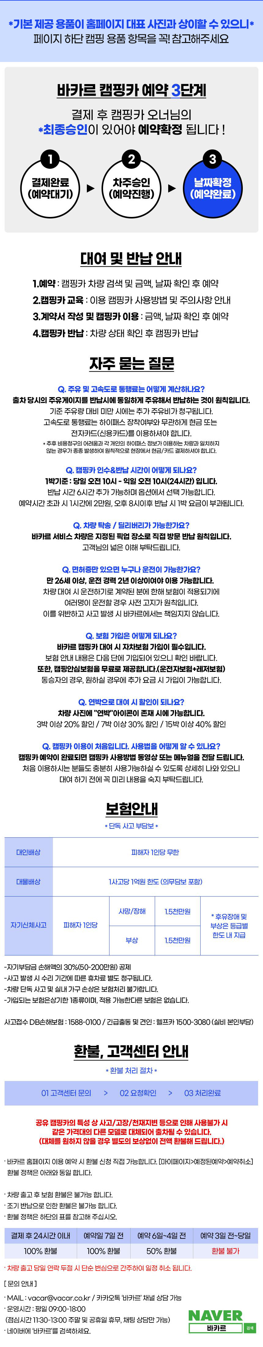 1. 예약 - 웹/앱 내에서 결제 완료하시면, 차주가 승낙/거절 합니다. 2. 차량 상태 점검 - 이용 전일 차량 내외부 상태, 간단한 안전, 연료상태 확인 등 점검을 합니다 3. 계약서 작성 - 출차 1~3일전 비대면계약서 카카오톡 전송 > 서명 (출차시 면허증 반드시 지참) 4. 캠핑카 사용방법 안내 - 캠핑카 사용시 주의 사항 및 이용방법에 대한 설명 5. 차량 대여 시작 6. 차량 상태 확인 및 반납 - 반납시간에 맞추어 반납장소에서 바카르 크루 동행하에 차량 상태 확인 및 반납