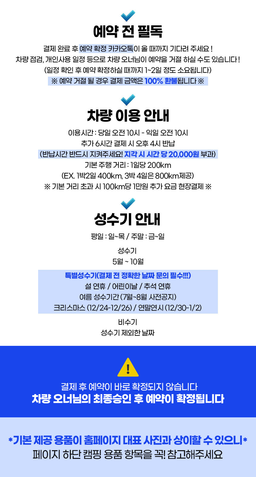 당일 오전 10시~익일 오전 10시 1박 기준입니다. 반납 시간 6시간 추가(6만원)하여 오후4시까지 연장 가능합니다. 지각비는 시간당 2만원씩 발생하므로 반납시간을 준수 부탁드립니다.